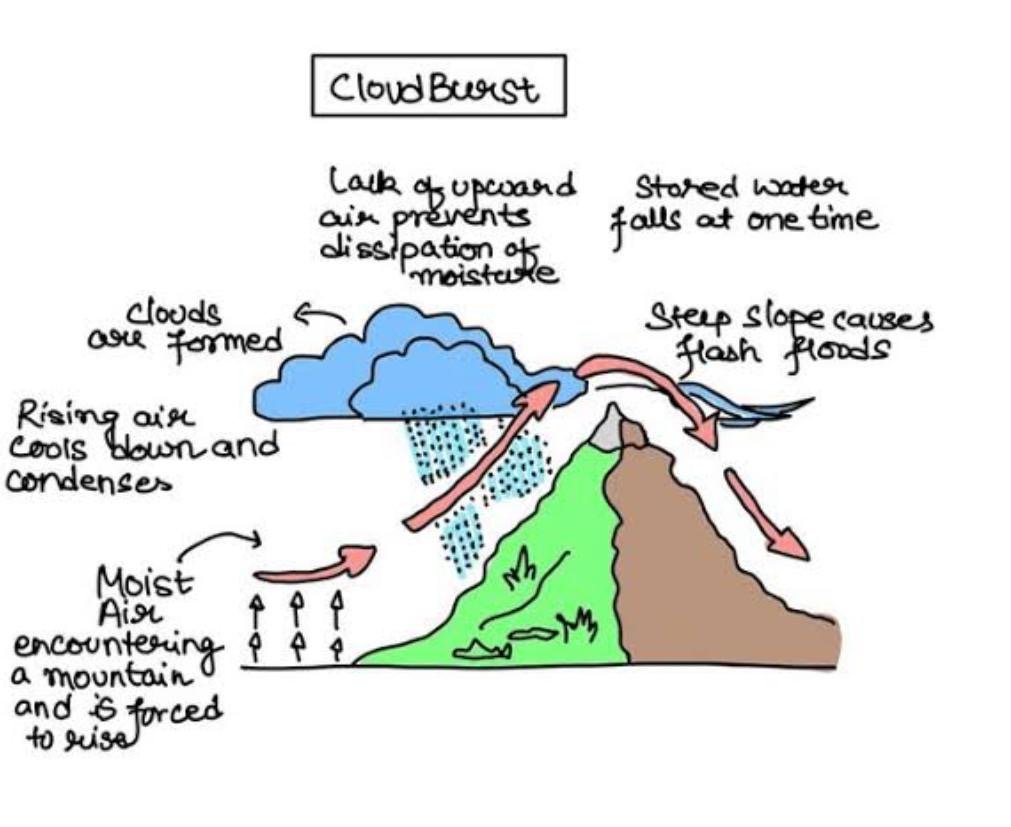During the monsoon, winds carry warm, moisture-rich air from the sea. When this air meets the mountains, the terrain forces it to rise. As it climbs, the air cools and the moisture condenses, forming clouds and the process is known as orographic lift. When these clouds get trapped in valleys and reach their maximum water-holding capacity, they unleash heavy, sudden rain known as a cloudburst, creating orographic rainfall in the region.